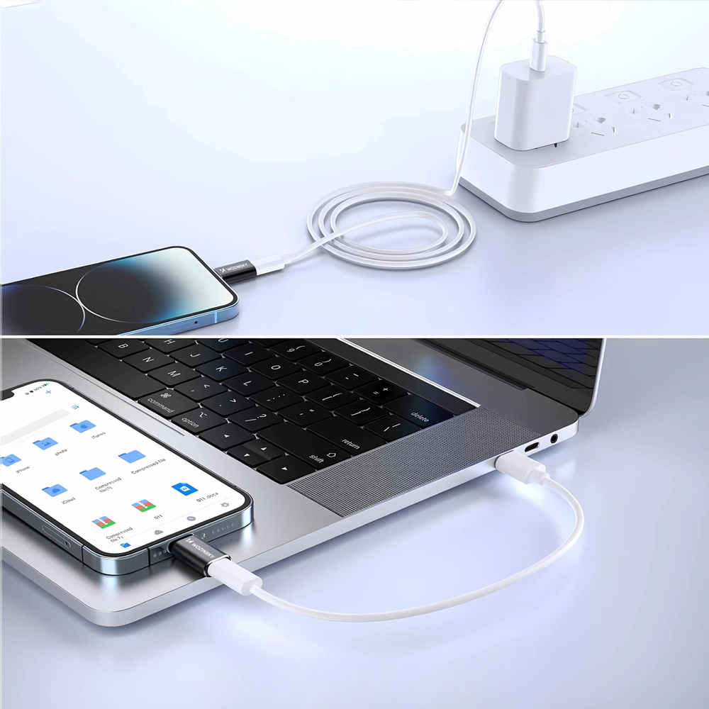 - Złącza: Lightning (męski) na USB-C (żeński) – umożliwia podłączenie kabla USB-C do portu Apple.