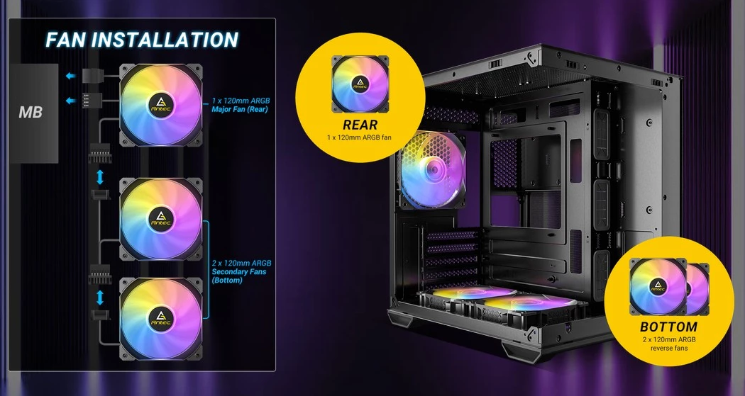 - Chłodzenie fabryczne: 3 wentylatory ARGB – dwa modele reverse na dole oraz jeden klasyczny z tyłu obudowy.