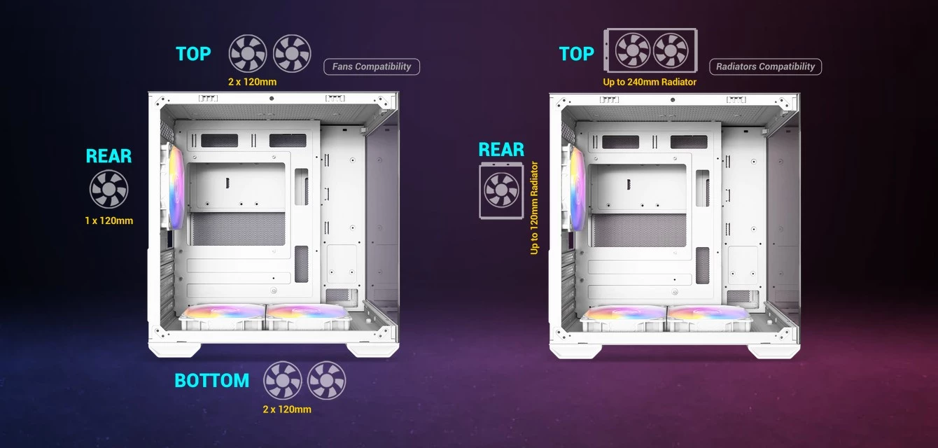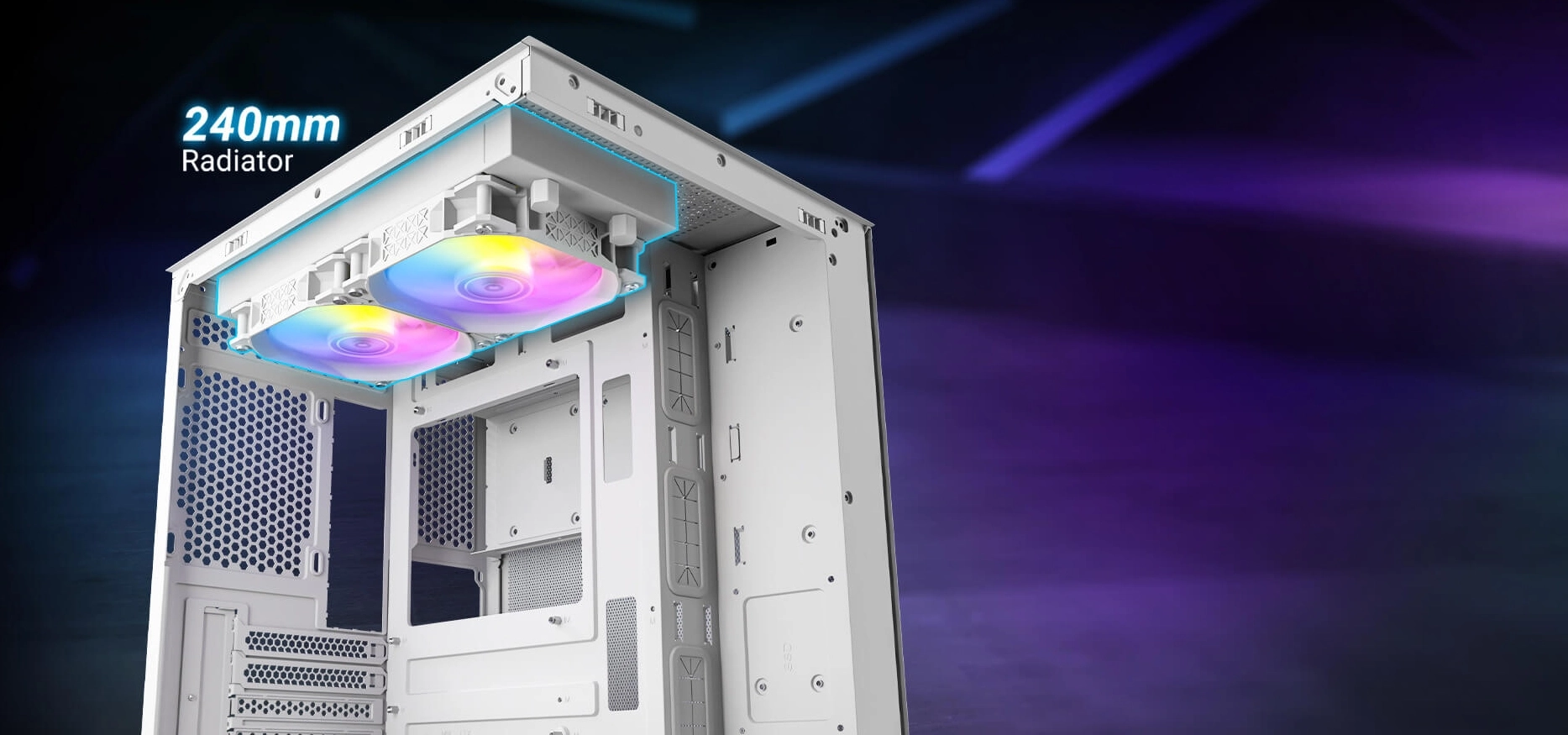 - Wsparcie dla chłodnic 240 mm – możliwość montażu radiatora na górnym panelu.
