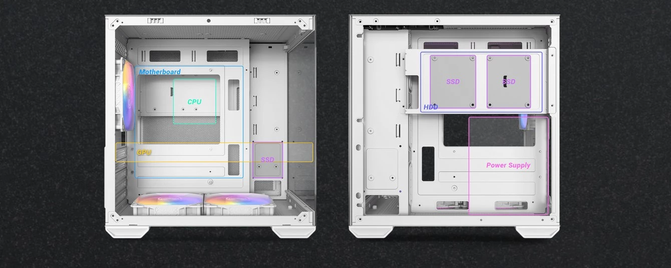 - Konstrukcja dwukomorowa – oddzielenie strefy chłodzenia procesora i grafiki od zasilacza.
