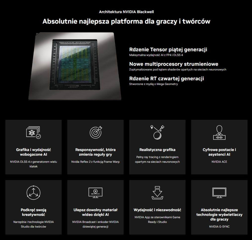 Seria RTX 50 została zaprojektowana z myślą o gry na najwyższym poziomie wizualnym, ale także o zastosowaniach kreatywnych: edycji wideo, renderingu 3D czy pracy z narzędziami AI. NVIDIA kontynuuje rozwój platformy NVIDIA Studio i narzędzi takich jak NVIDIA Broadcast czy RTX Video Super Resolution, które wykorzystują moc rdzeni Tensor piątej generacji do poprawy efektywności prac twórczych i komunikacji multimedialnej. Dzięki temu seria RTX 50 nie jest już tylko produktem dla graczy, lecz pełnoprawną platformą akcelerującą zadania oparte na sztucznej inteligencji i przetwarzaniu treści. Wprowadzając obsługę standardów takich jak DirectX 12 Ultimate, wielomonitorowe konfiguracje o wysokich częstotliwościach odświeżania i zaawansowane enkodery NVENC/NVDEC, karty RTX 50 odpowiadają na potrzeby zarówno entuzjastów PC, jak i twórców filmów, streamerów oraz programistów pracujących z narzędziami GPU‑intensywnymi.
