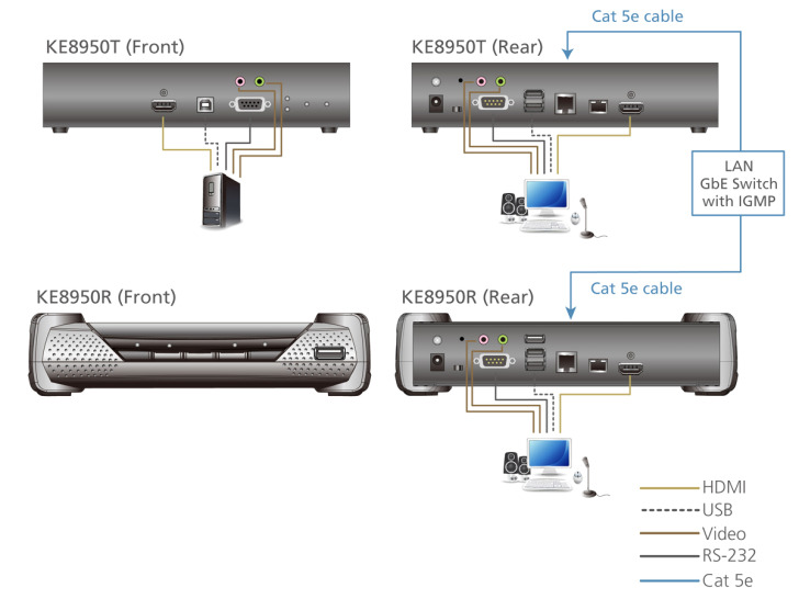 Ekstender 4K HDMI KVM over IP składa się z transmitera podłączanego do komputera oraz odbiornika, który zapewnia dostęp konsoli z zdalnej lokalizacji. Dostęp do komputera z konsoli zdalnej następuje z wykorzystaniem standardowej sieci TCP/IP za pośrednictwem kabla Cat 5e/6, który umożliwia administrację typu punkt-punkt, punkt-wiele punktów oraz wiele punktów-wiele punktów. KE8950 można podłączyć bezpośrednio do siebie lub z wykorzystaniem sieci typu high-speed, poprzez przewody miedziowe lub światłowodowe.