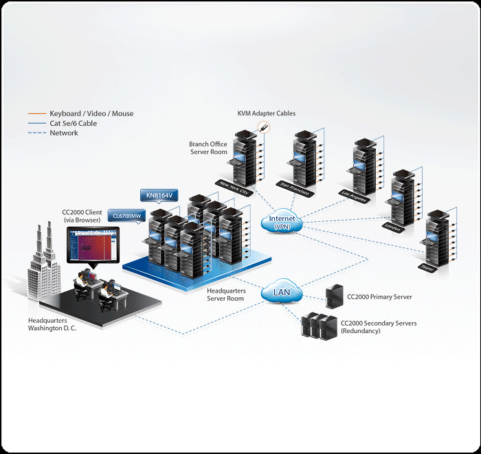 W połączeniu z dowolnymi przełącznikami KVM over IP, urządzeniami Serial Console Server i Power Over the NET oprogramowanie do zarządzania CC2000 umożliwia administratorowi zdalne monitorowanie i kontrolowanie wszystkich zainstalowanych urządzeń, w tym serwerów typu blade i maszyn wirtualnych. Zastosowana w oprogramowaniu CC2000 architektura serwerów głównych i zapasowych (Primary-Secondary) zabezpiecza transmisję danych, zapewniając wbudowaną nadmiarowość, w tym uaktualnianie baz danych w czasie rzeczywistym oraz automatyczne funkcje tworzenia kopii zapasowych serwerów głównego i zapasowego oraz urządzeń. Dzięki nadmiarowości w przypadku usterki dowolnego serwera, system zarządzania CC2000 funkcjonuje nadal - nadmiarowy moduł zapasowy ("Secondary") przejmuje działanie i zapewnia wymagane usługi do czasu wznowienia pracy modułu głównego ("Primary"). Ta funkcja podwójnej nadmiarowości (każdy serwer zapasowy może mieć własny moduł zapasowy) zapewnia płynny dostęp do wszystkich urządzeń i zarządzanie nimi.