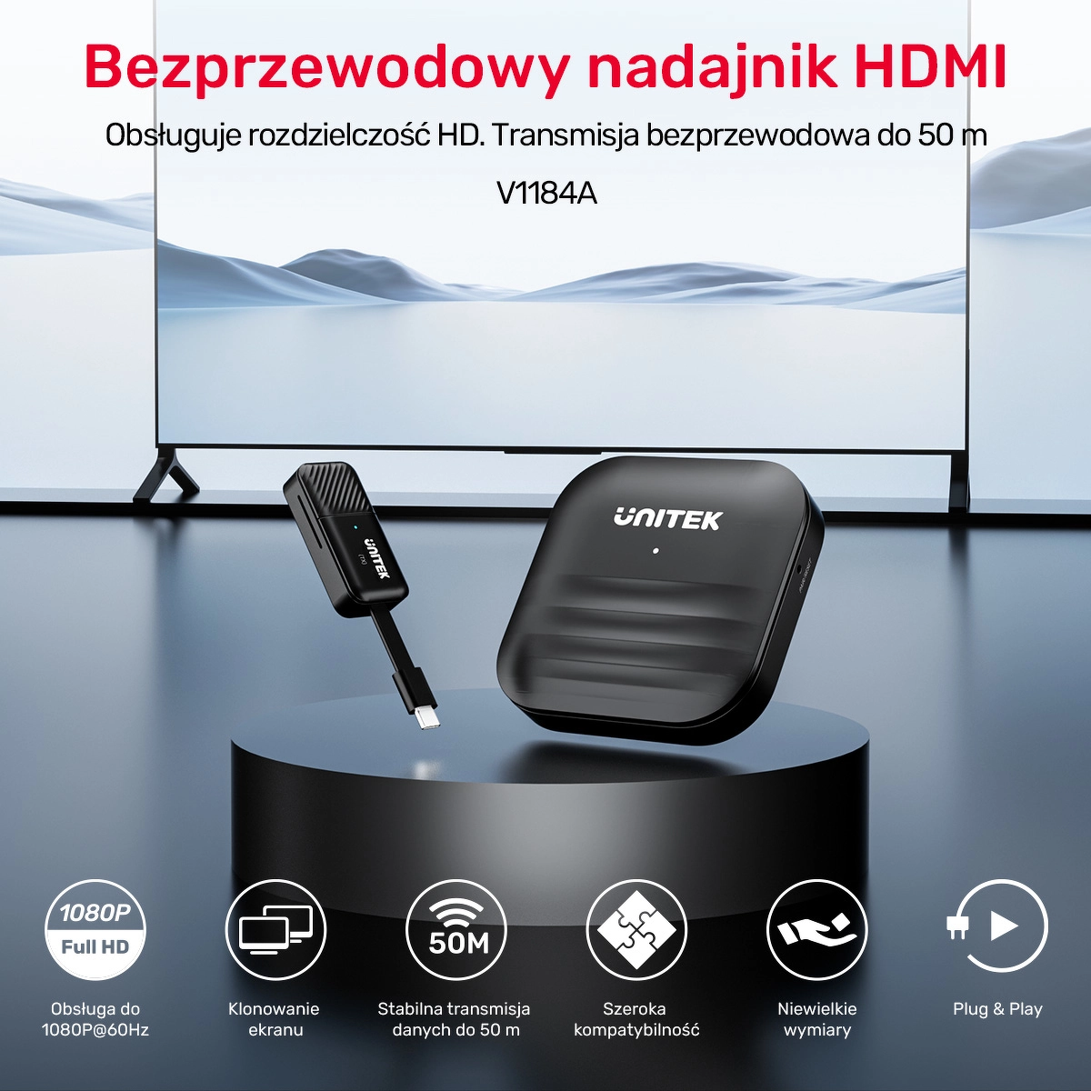 Bezprzewodowy nadajnik HDMI Unitek zasięg do 50m, czarny (V1184A01)