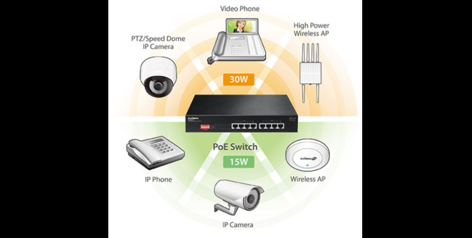 Edimax GS-1008P v2 posiada osiem portów IEEE802.3at Power over Ethernet (PoE+), które dostarczają do 30 watów energii elektrycznej na port. Może konwertować standardową zasilanie 100~240V do niskonapięciowej 50~57V DC, aby zasilać akcesoria sieciowe zgodne ze standardem IEEE802.3at, za pomocą istniejących kabli sieciowych (LAN). Dzięki możliwości wykrywania PoE GS-1008P v2 sprawdza, czy podłączone urządzenie spełnia wymagania standardu IEEE802.3at. W przypadku, gdy urządzenie PoE nie zostanie wykryte, tylko dane sieciowe będą przesyłane przez kabel LAN - co oznacza łatwą konfigurację i zarządzanie urządzeniami sieciowymi, takimi jak punkty dostępu i kamery sieciowe.