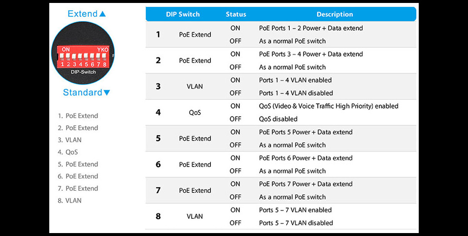 | DIP Switch | PoE Extend, VLAN, QoS | ||