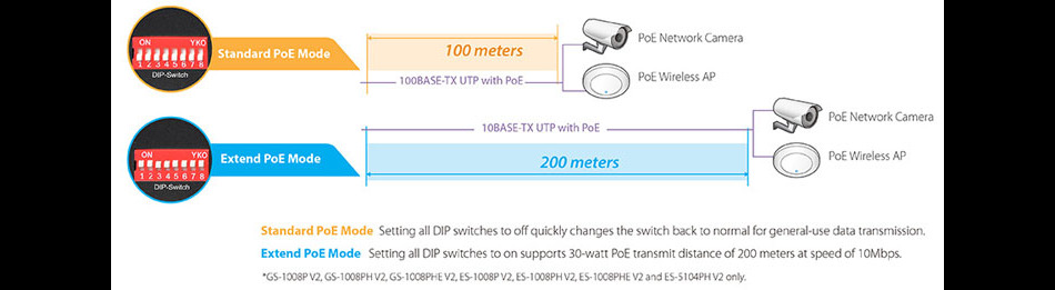 Wbudowany przełącznik DIP zapewnia rozszerzone tryby pracy po przełączeniu przełączników 1, 2, 5, 6 i 7. GS-1008P v2 działa jako standardowy przełącznik IEEE802.at/af PoE, gdy wyłączniki DIP są wyłączone. Po włączeniu przełącznik GS-1008P v2 działa na zasadzie per-portu z prędkością dupleksu 10Mb/s, ale może obsługiwać moc wyjściową PoE 30W w odległości do 200 metrów, pokonując barierę 100 metrów na kablach Ethernet UTP. Dzięki tej zupełnie nowej funkcji, GS-1008P v2 zapewnia dodatkowe rozwiązanie dla rozszerzenia odległości 802.3at/af PoE i oszczędza koszty instalacji kabla Ethernet.