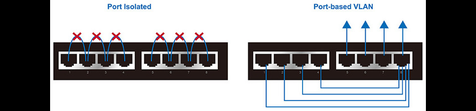 GS-1008P v2 posiada portową sieć VLAN, w której porty mogą być izolowane od siebie za pośrednictwem przełączików 3 i 8. na przełączniku DIP. Może to zapobiegać oddziaływaniu na siebie nawzajem.