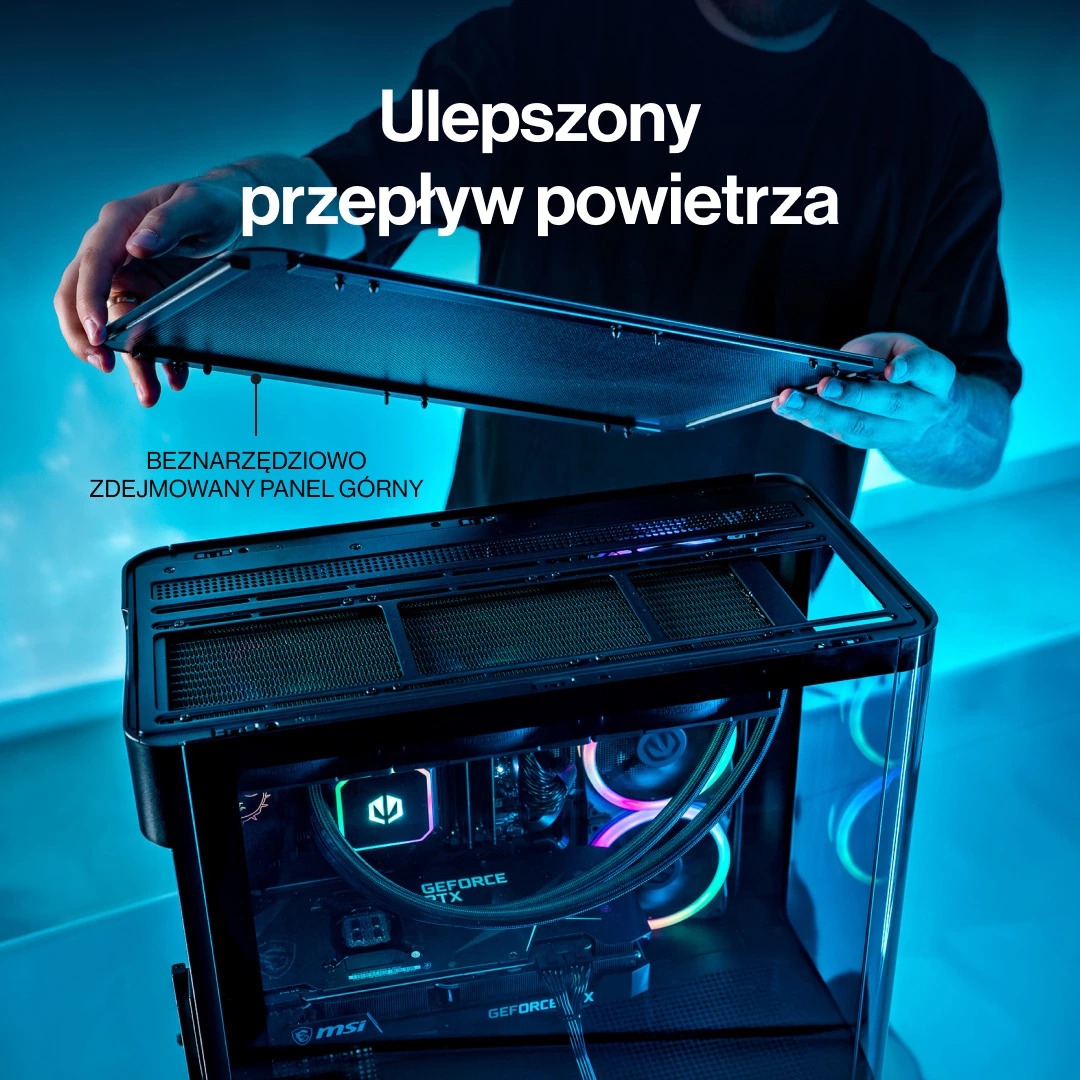 - Zarządzanie okablowaniem: Przestronna sekcja za tacką płyty głównej i dedykowana piwnica na zasilacz o długości do 440 mm.