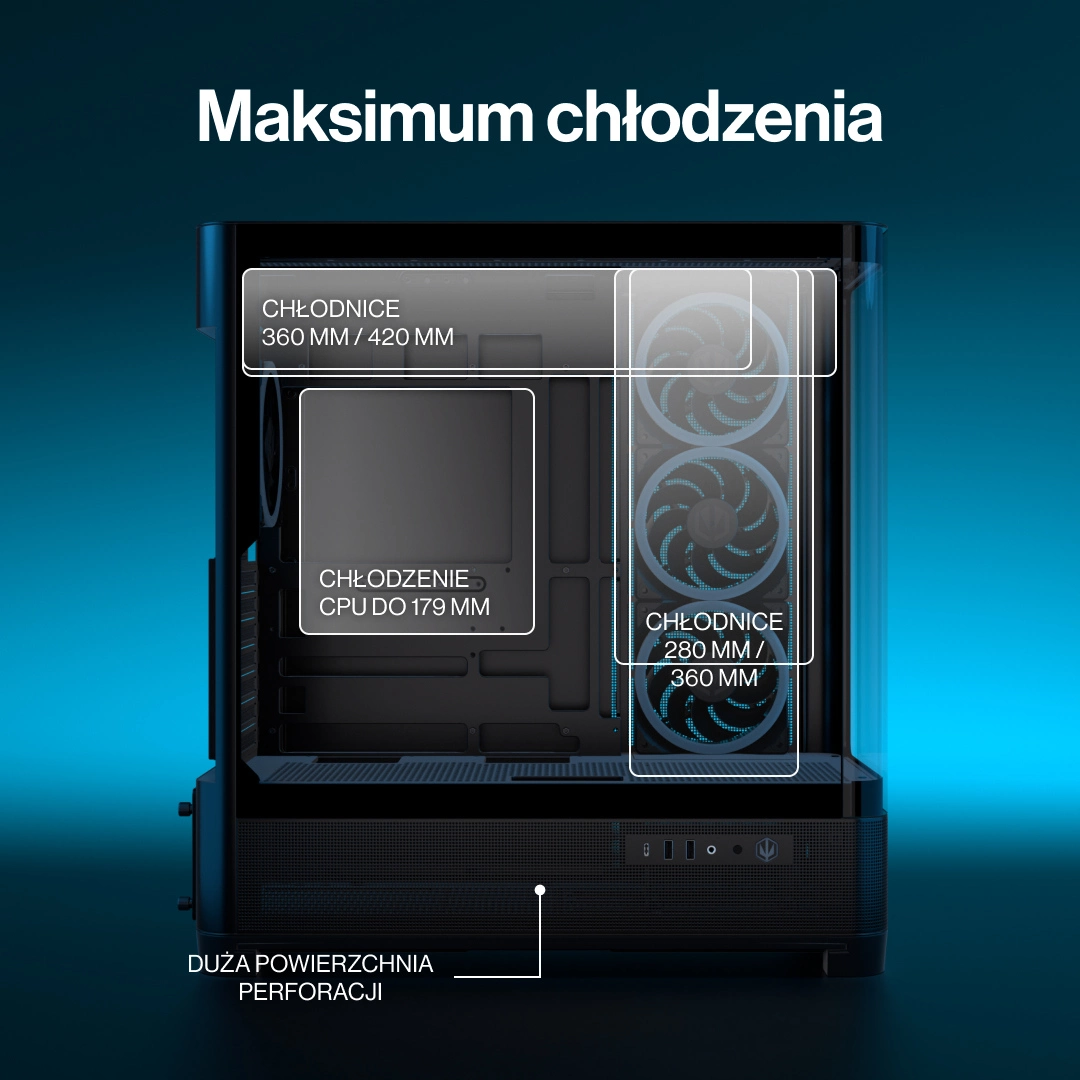 - System chłodzenia: Wsparcie dla radiatorów o długości do 420 mm na górze oraz 360 mm z boku obudowy.