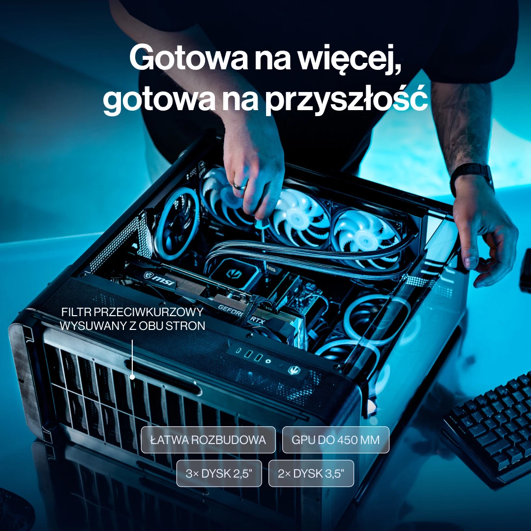 - Pojemność wnętrza: Miejsce na karty graficzne o długości do 450 mm oraz systemy chłodzenia powietrznego do 179 mm.