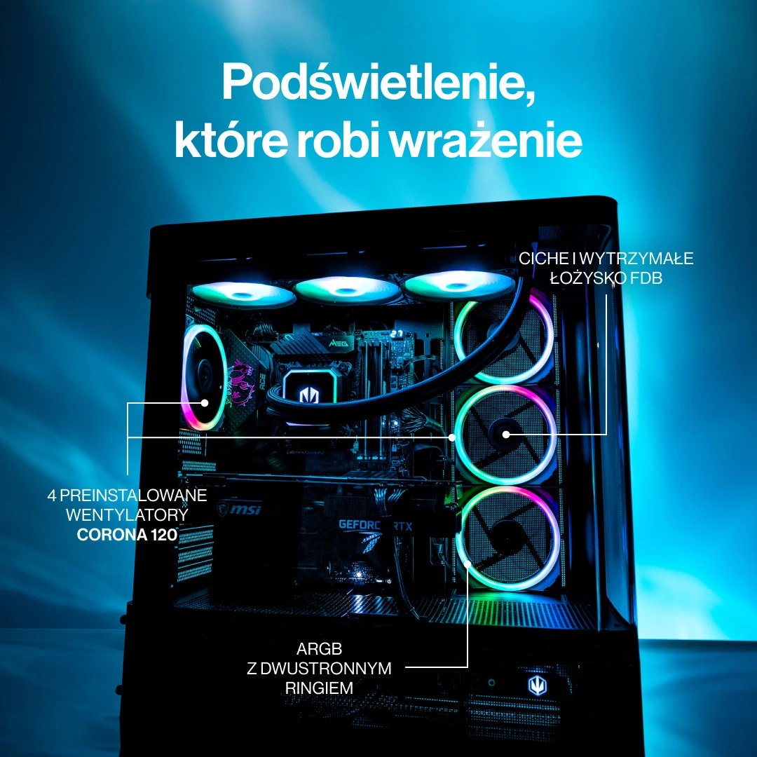 - Wentylatory w zestawie: Cztery fabryczne jednostki 120 mm z podświetleniem ARGB i precyzyjnym sterowaniem PWM.