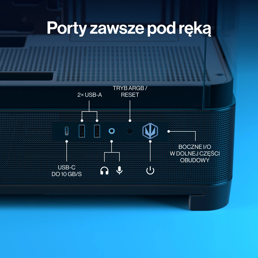 - Złącza zewnętrzne: USB-C 3.2 Gen 2 (10 Gbps) oraz 2x USB-A - Szybka łączność i wygodny dostęp do portów na boku obudowy.