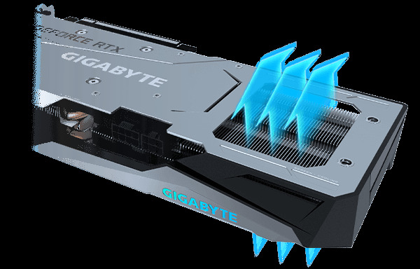 Radiatora umożliwia przepływ powietrza przez kartę, zapewniając lepsze rozpraszanie ciepła. Dzięki specjalnie zaprojektowanym ciepłowodom z czystej miedzi, które maksymalizują obszar bezpośredniego kontaktu z procesorem graficznym i pamięcią VRAM możliwe jest skuteczne odprowadzanie nagromadzonego ciepła do radiatora. Ochronny metalowy back plate nie tylko zapewnia estetyczność, ale także wzmacnia strukturę karty graficznej, zapewniając pełną ochronę.