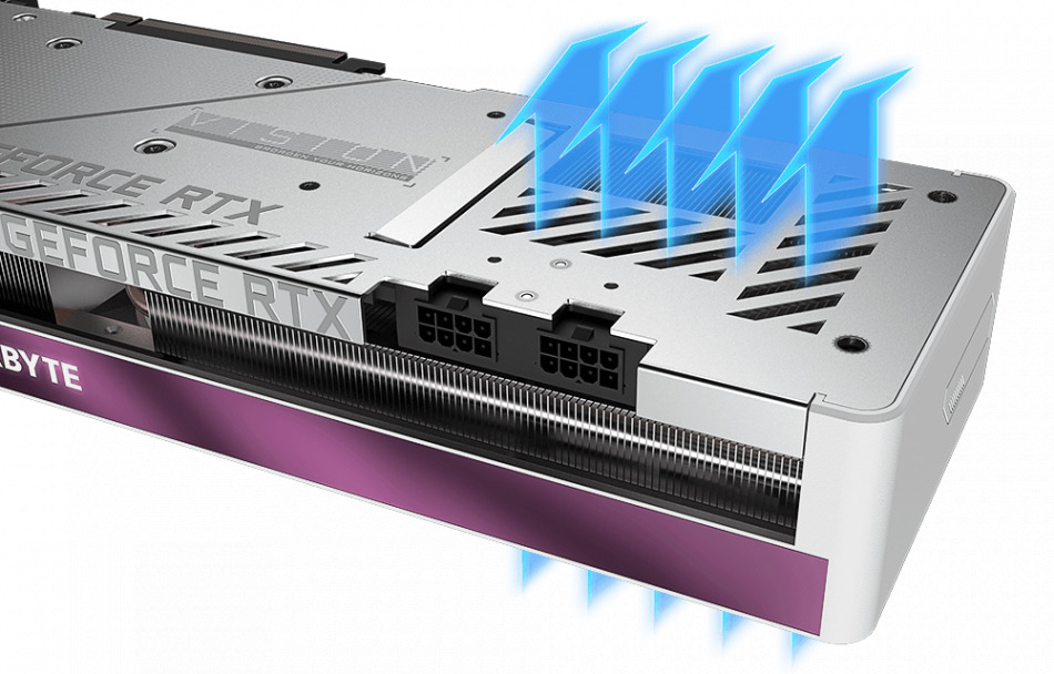 Radiatora umożliwia przepływ powietrza przez kartę, zapewniając lepsze rozpraszanie ciepła. Dzięki bezpośredniemu kontaktowi dużej miedzianej płyty z procesorem graficznym i pamięcią VRAM możliwe jest skuteczne odprowadzanie ciepła przez kompozytowe rurki do radiatora. Ochronny metalowy back plate nie tylko zapewnia estetyczność, ale także wzmacnia strukturę karty graficznej, zapewniając pełną ochronę.
