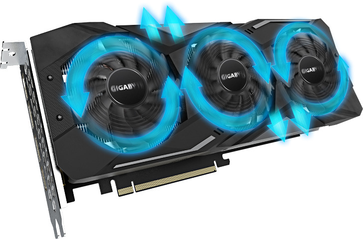 Trzy aktywne wentylatory o średnicy 82 mm z unikalnym kształtem łopat zwiększają przepływ powietrza oraz zapewniają półpasywne chłodzenie, pozwala to cieszyć się rozgrywką w całkowitej ciszy, gdy układ GPU nie jest w pełni obciążony. Wentylatory obracają się w przeciwnych kierunkach, dzięki temu kierunek przepływu powietrza między trzema wentylatorami jest taki sam, zwiększa to ciśnienie przepływu powietrza oraz wydajność rozpraszania ciepła.