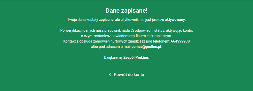 4. Twój formularz został wysłany i zostanie zweryfikowany. Zostaniesz poinformowany o aktywacji konta hurtowgo przez e-mail. Zawsze możesz skontaktować się z obługą zamówień hurtowych pod telefonem: 664999930 albo pod adresem e-mail pomoc@proline.pl.