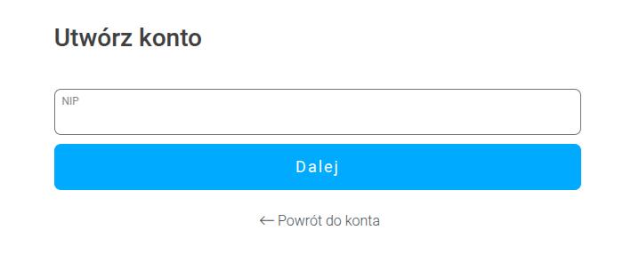 2. Zostaniesz przekierowany do formularza rejestracji. Na początku wpisz swój numer NIP i kliknij "Dalej".