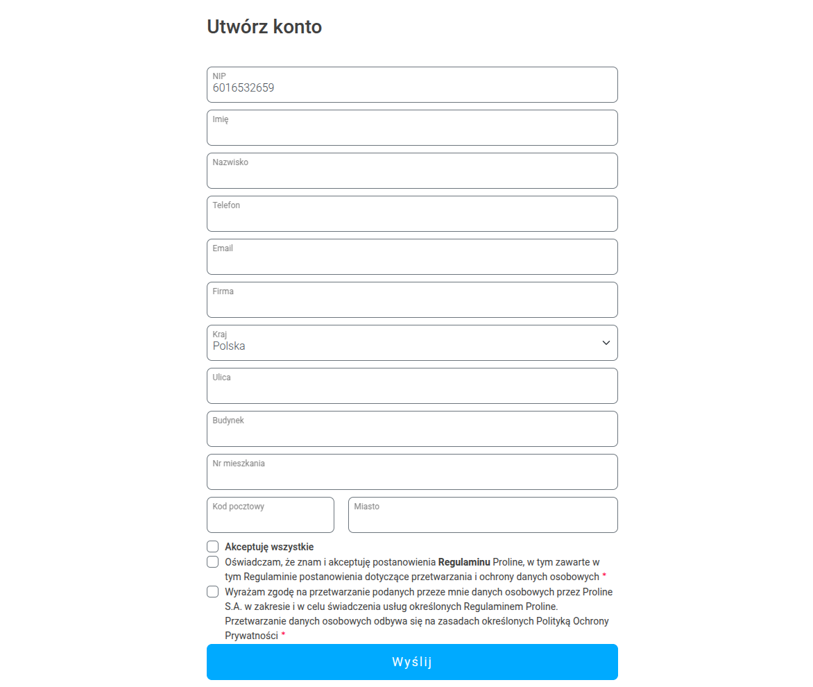 3. Wypełnij formularz rejestracji konta hurtowego niezbędnymi informacjami. Musisz zaznaczyć oświadczenia i zgody i nacisnąć "Wyślij"
