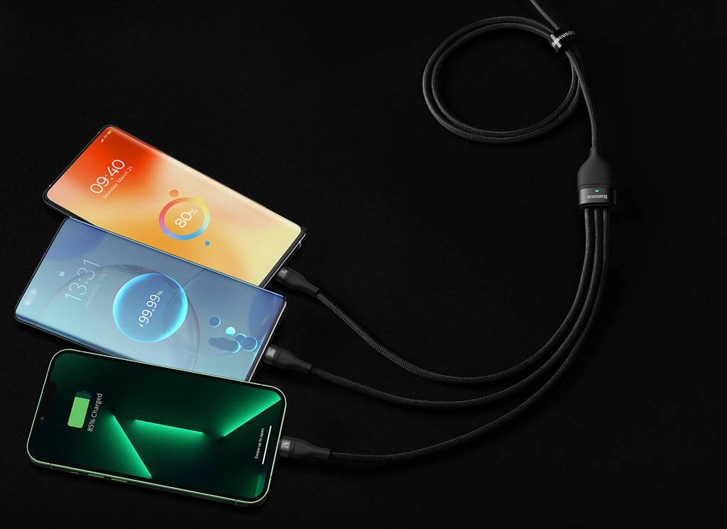 - Złącza: 3w1 – jedno akcesorium obsługuje standardy USB-C, Lightning oraz Micro USB jednocześnie.