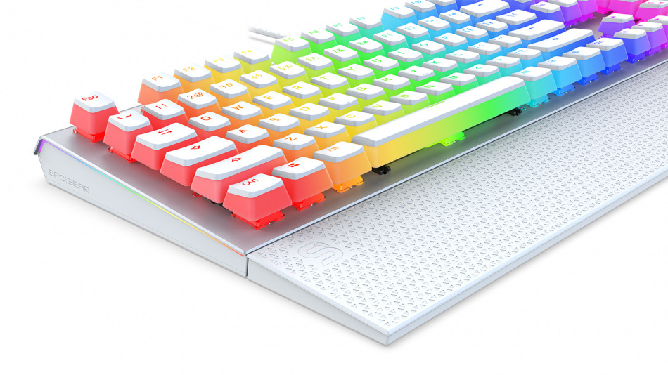Wygląd klawiatury SPC Gear GK650K Omnis Kailh Blue RGB Onyx White Pudding Edition jest połączeniem klasycznego stylu i gamingowego pazura. Jej ostre zarysowane krawędzie i wyprofilowany aluminiowy top wraz z podpórką na nadgarstki z przetłoczeniami świetnie wyglądają zarówno na biurku gracza jak i w środowisku biurowym. To jednak nie wszystko, gdyż klawiatura została wyposażona także w paski LED RGB umiejscowione po bokach, które dodatkowo rozświetlają i wizualnie wzbogacają stanowisko komputerowe.