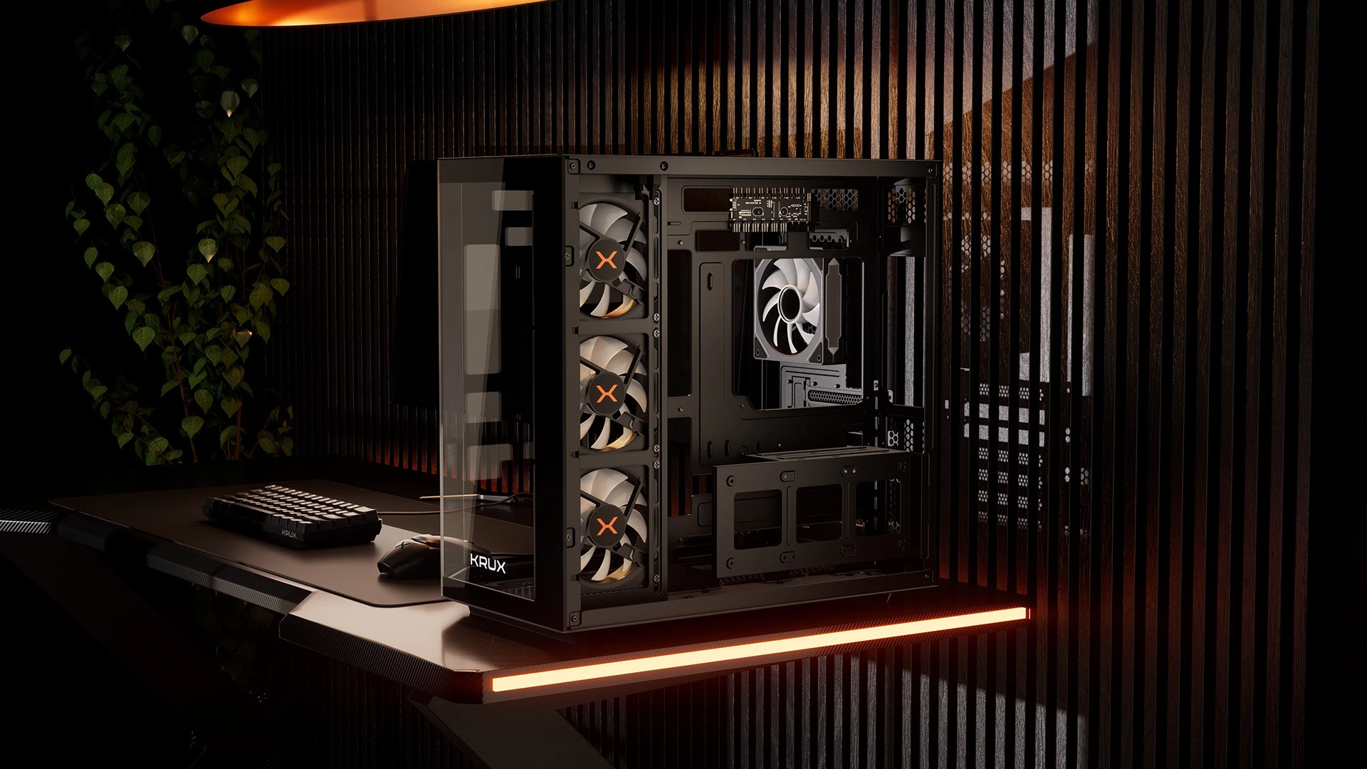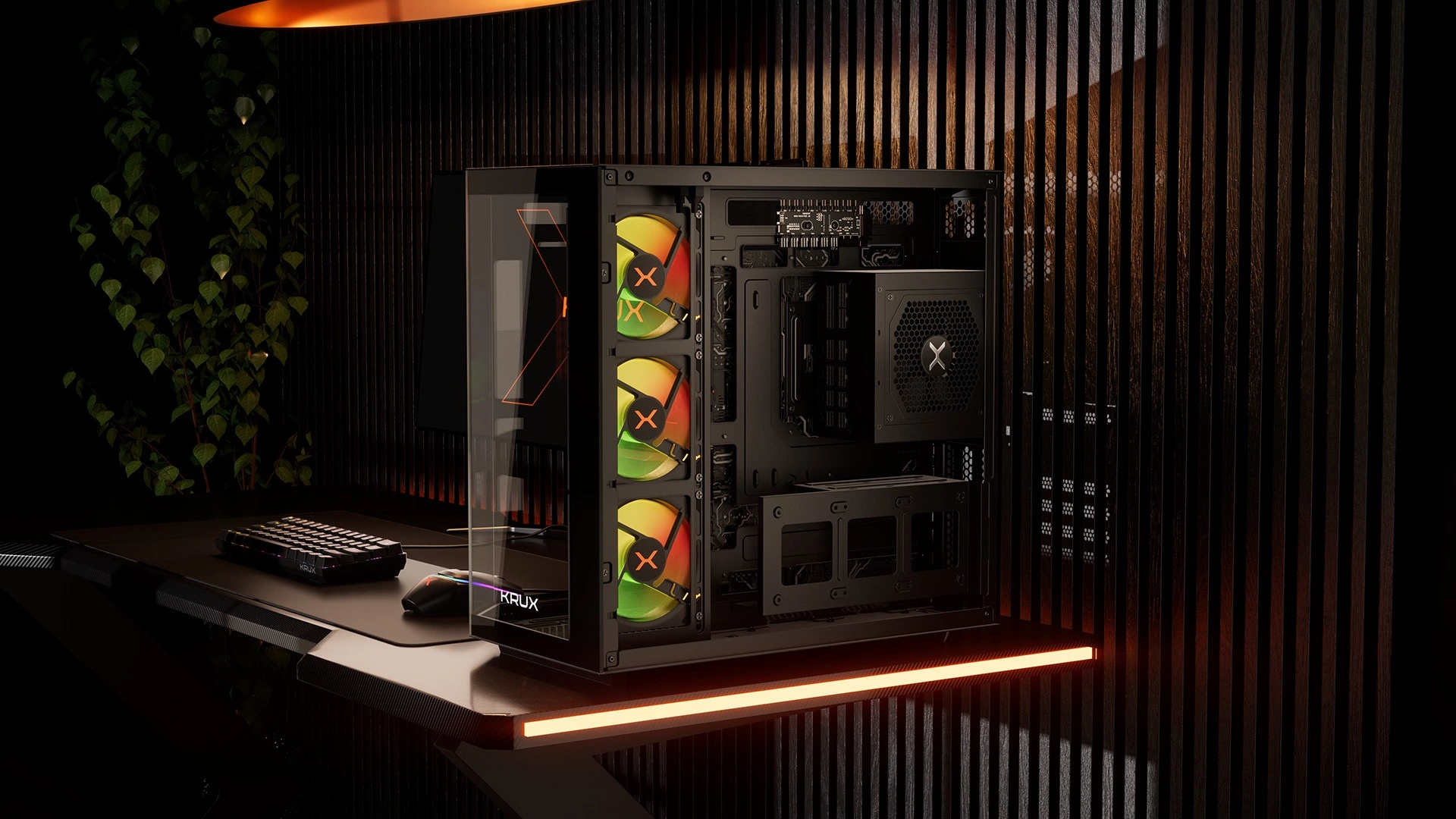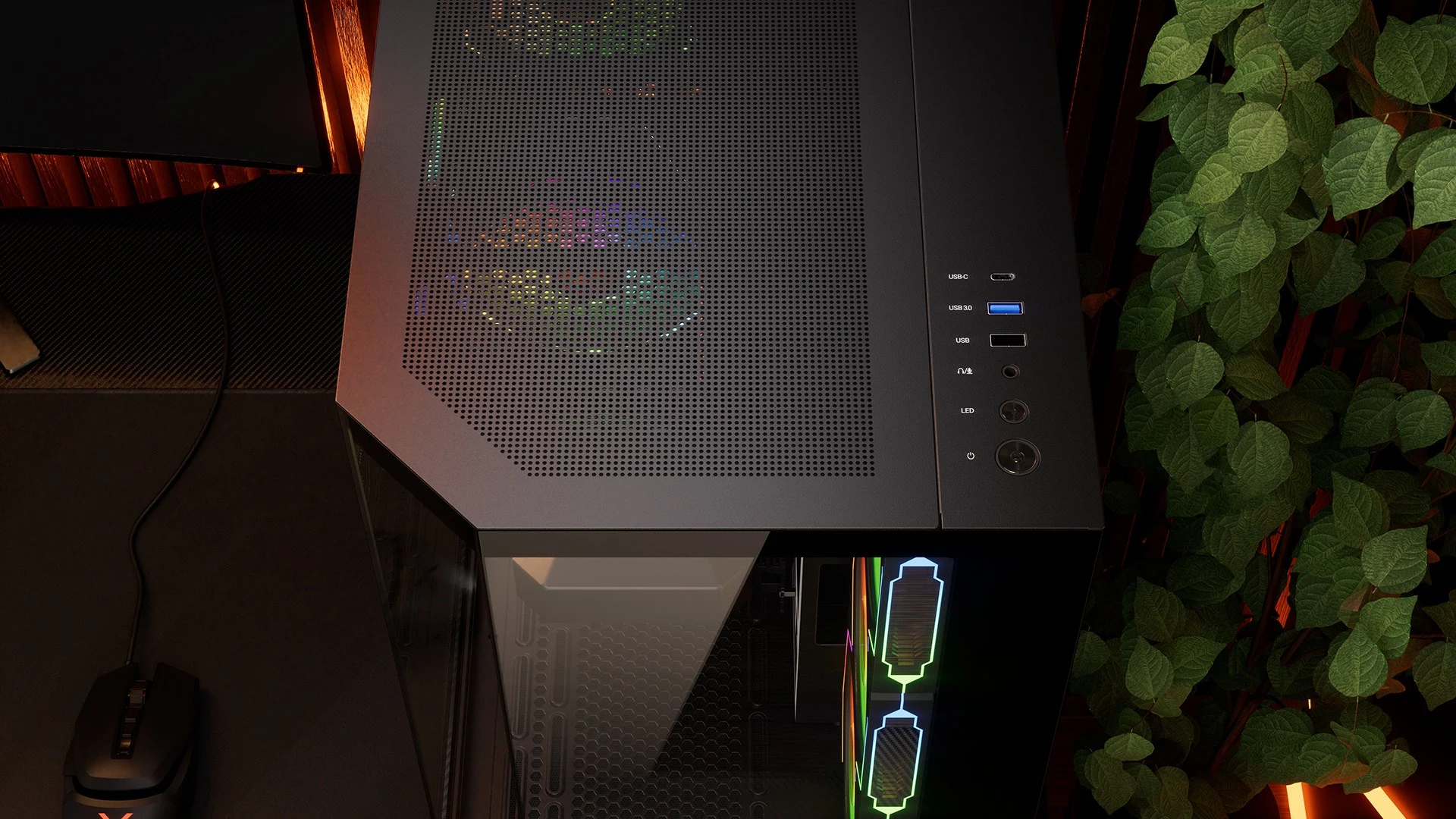 - Innowacyjna konstrukcja: Boczna komora zasilacza – Przeniesienie jednostki zasilającej za tackę płyty głównej optymalizuje przepływ powietrza i poprawia estetykę.