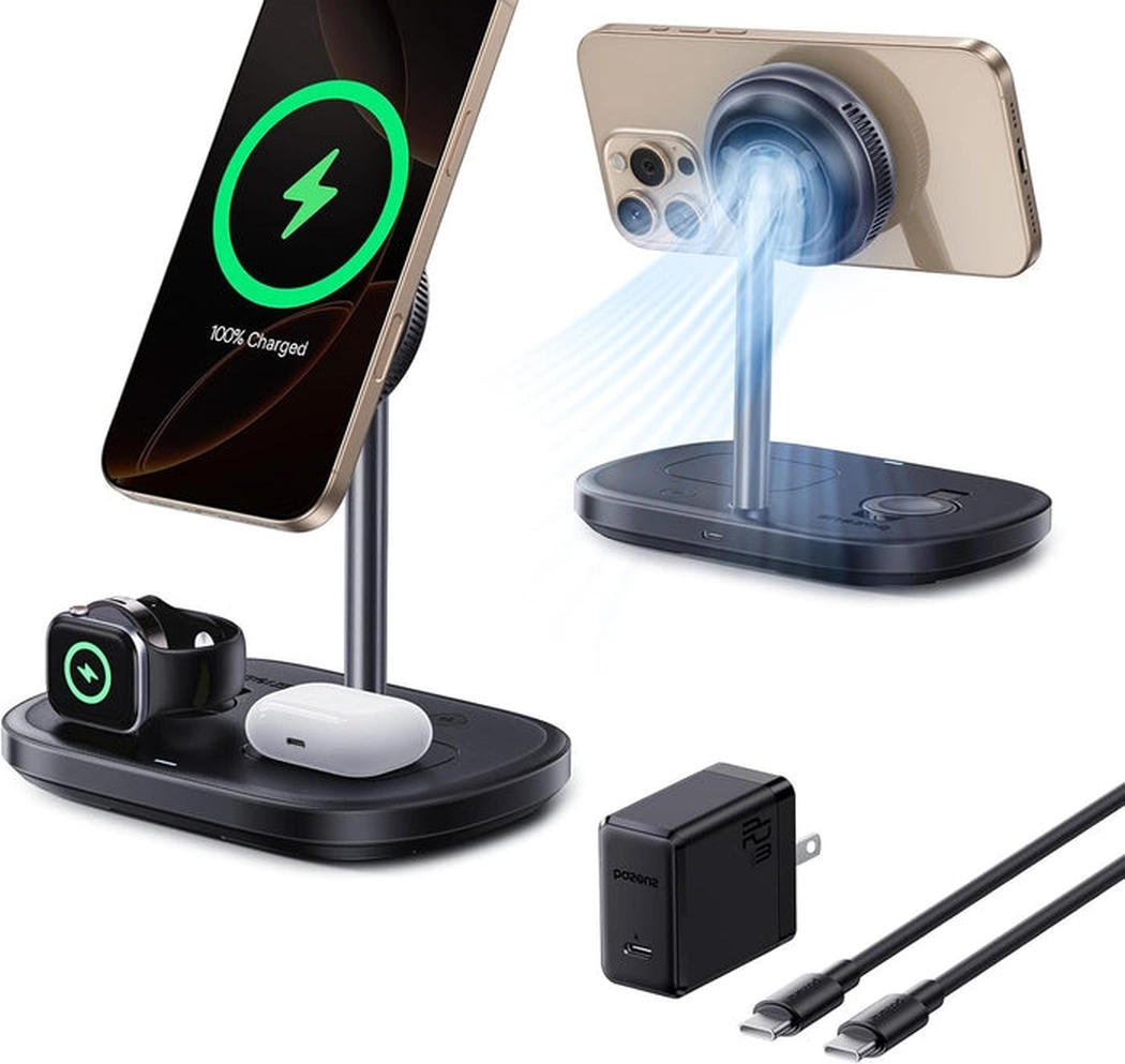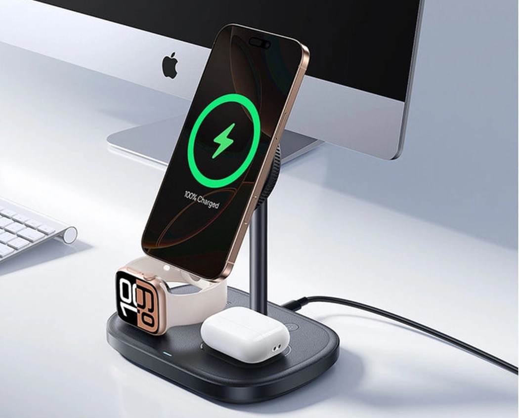 - Potrójna konstrukcja: umożliwia jednoczesne ładowanie telefonu, inteligentnego zegarka oraz słuchawek bezprzewodowych.