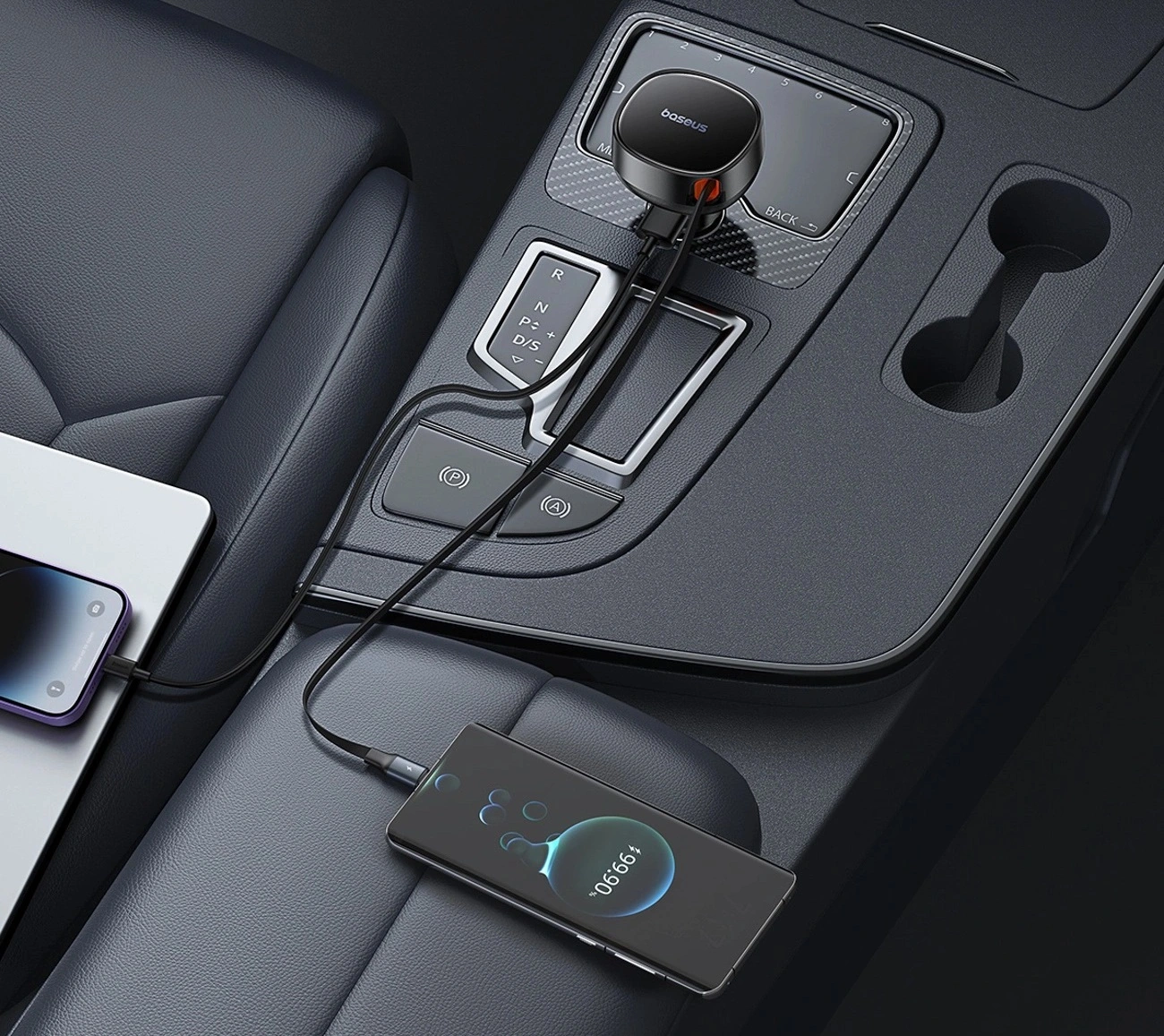 - Zintegrowany przewód: Zwijany 70 cm – innowacyjny mechanizm pozwala na zachowanie idealnego porządku w aucie.