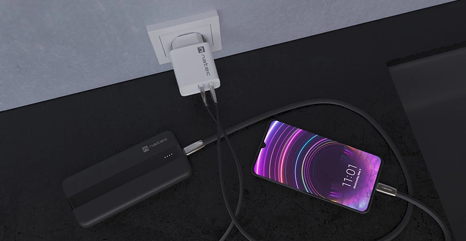 - Złącza: USB-C oraz USB-A – dwa porty pozwalające na ładowanie dwóch różnych akcesoriów w tym samym czasie.