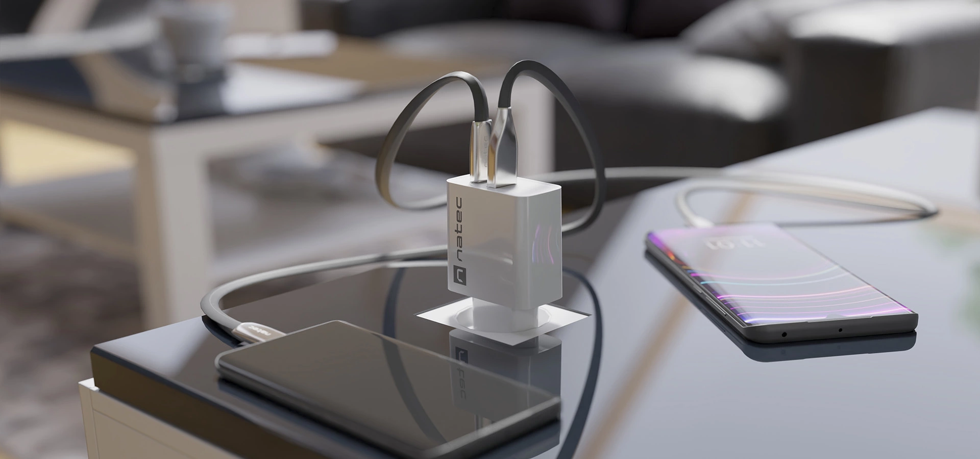Ładowarka sieciowa Natec Ribera GaN Slim 1x USB-A + 1x USB TYP-C 20W - biała