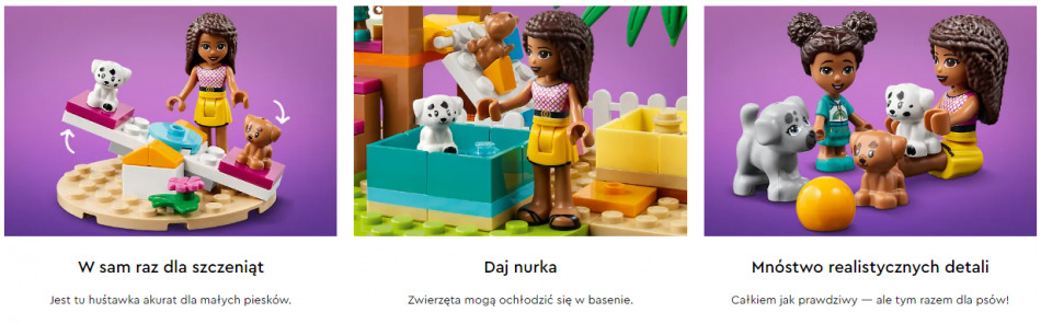 - Dodatkowe elementy — w komplecie minilaleczka LEGO® Friends Andrea, mikrolaleczka Liz, trzy figurki piesków oraz szufelka, miotła, klocek w kształcie kupy i piłka