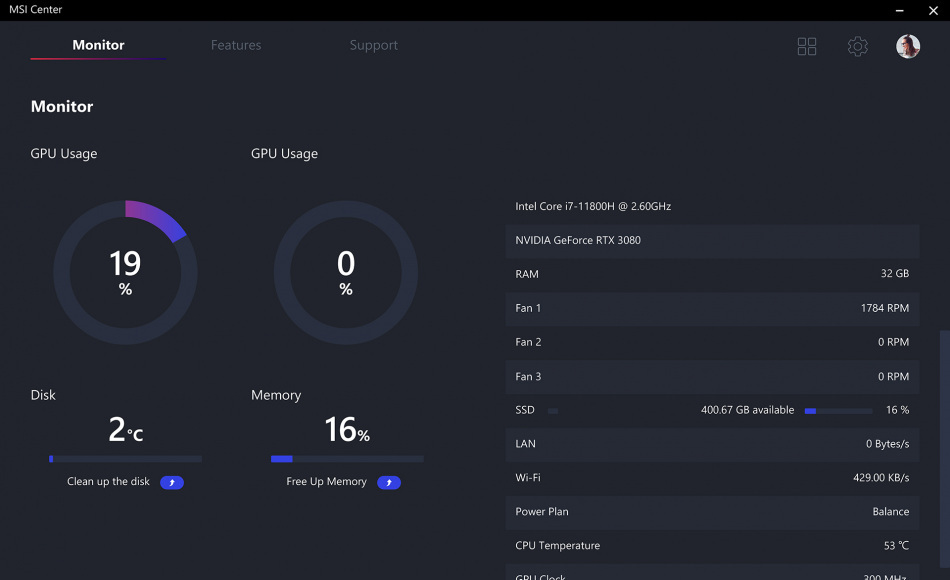 Ekskluzywne oprogramowanie MSI Center firmy MSI pomaga w pełni wykorzystać możliwości produktów MSI. Monitoruj, dostosowuj i optymalizuj w czasie rzeczywistym za pomocą kilku kliknięć.
