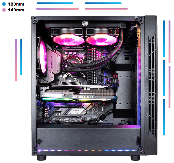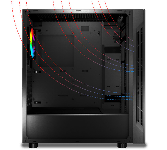 Wsparcie dla systemu chłodzenia powietrzem umożliwia montaż maksymalnie sześciu wentylatorów, dwóch o średnicy 120 lub 140 mm u góry, trzech o średnicy 120 lub dwóch o średnicy 140 mm z przodu oraz jednego o średnicy 120 lub 140 mm z tyłu obudowy. Fabrycznie obudowa została wyposażona w jeden wentylator RGB o średnicy 120 mm z tyłu obudowy, zapewnia on efektowne podświetlenie wnętrza komputera.