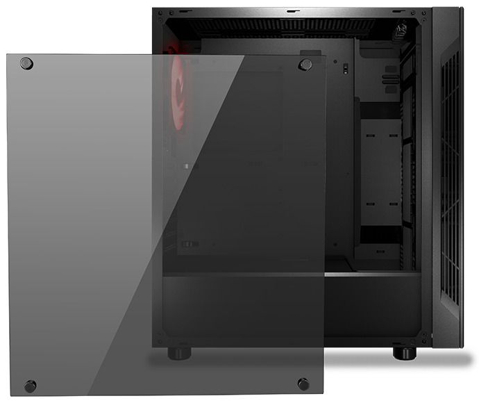 Lewy panel w jasnoszarym odcieniu został wykonany z hartowanego szkła o grubości 4 mm, które zapewnia dobry, klarowny widok na podzespoły znajdujące się we wnętrzu komputera.