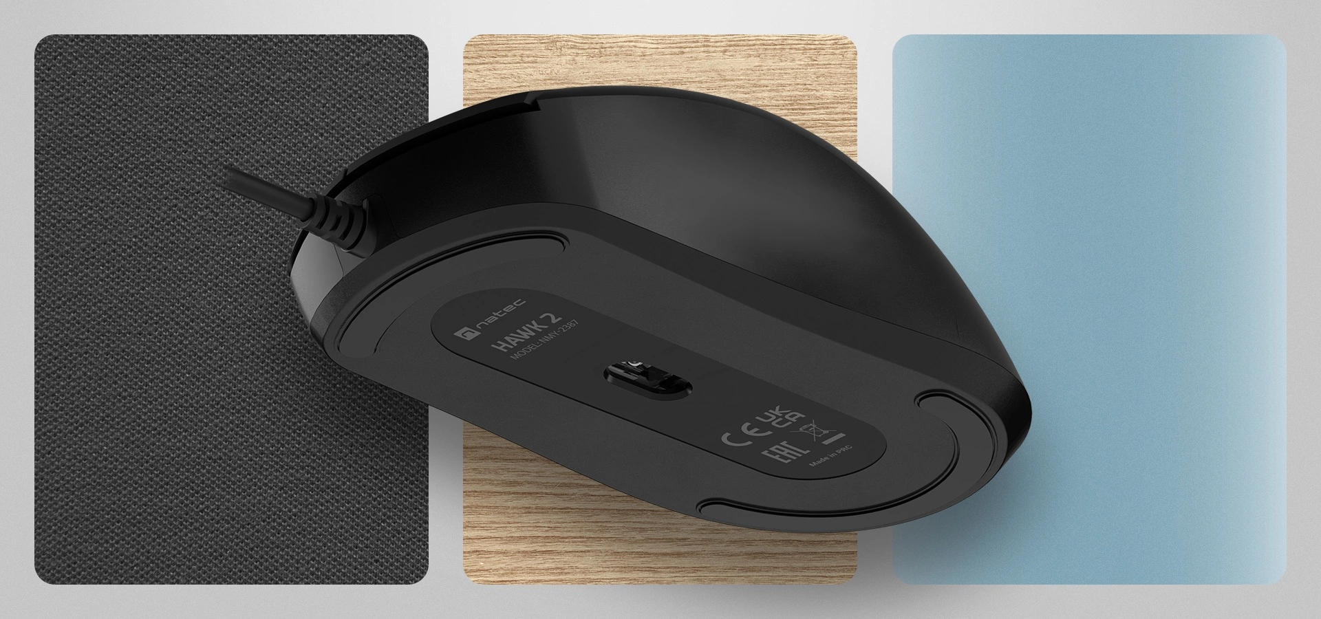 - Ślizgacze: teflonowe - gwarantują płynne prowadzenie myszy i redukcję oporu podczas ruchu.
