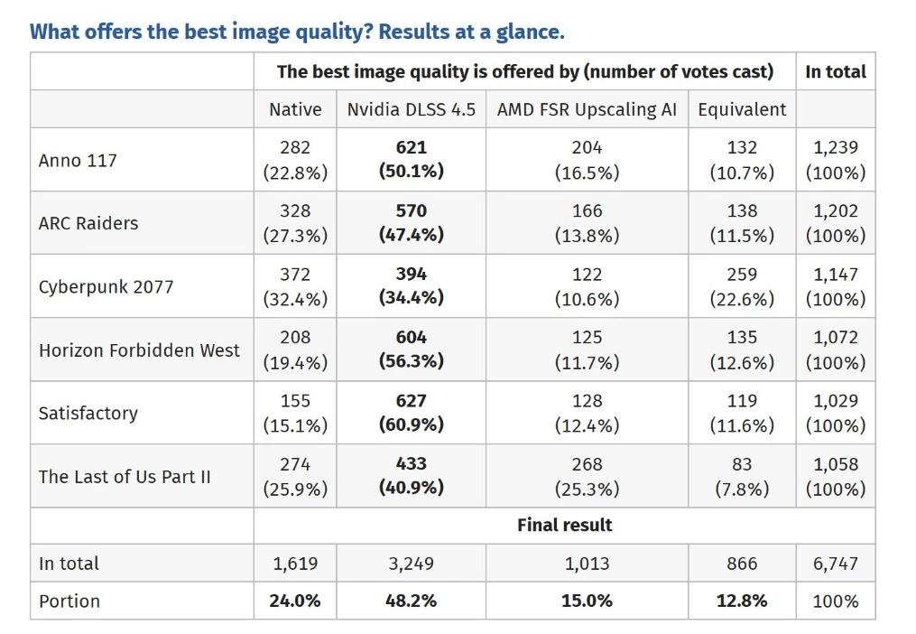 Badanie polegało na prezentacji identycznych fragmentów gier w kilku wariantach renderowania. Głosujący wybierali numer odpowiadający ich zdaniem najlepiej wyglądającej wersji. Dopiero po zakończeniu głosowania przypisano poszczególne numery do konkretnych technologii. Zestawienie wyników pokazało, że najwięcej wskazań otrzymały materiały odpowiadające DLSS 4.5. Drugie miejsce zajęło renderowanie natywne, natomiast najmniej wyborów przypadło wariantowi wykorzystującemu FSR 4. Tendencja ta powtarzała się w wielu testowanych scenach.