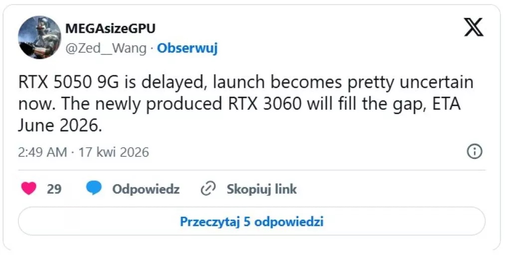 Dodaj pierwszą opinię: GeForce RTX 3060 12 GB wraca do produkcji. RTX 5050 9 GB na razie wstrzymany
