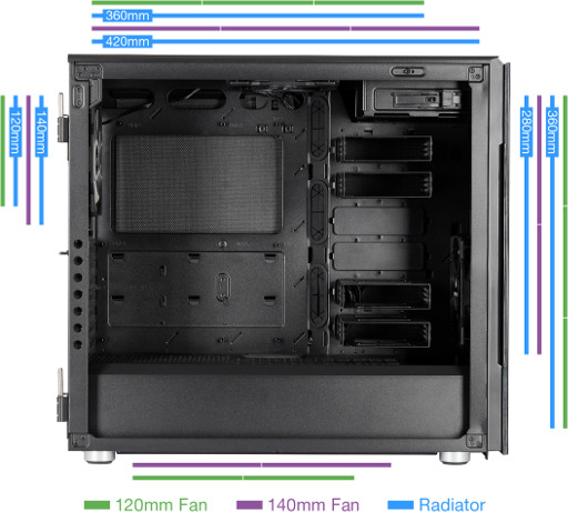 Wsparcie dla systemu chłodzenia cieczą umożliwia montaż chłodnicy o rozmiarze 120, 140, 240, 280, 360 lub 420 mm u góry, 120, 140, 240, 280 lub 360 mm z przodu oraz 120 lub 140 mm z tyłu obudowy. Dzięki temu można bez problemu zapewnić wentylację całego systemu w celu uzyskania większej stabilności pracy komputera.