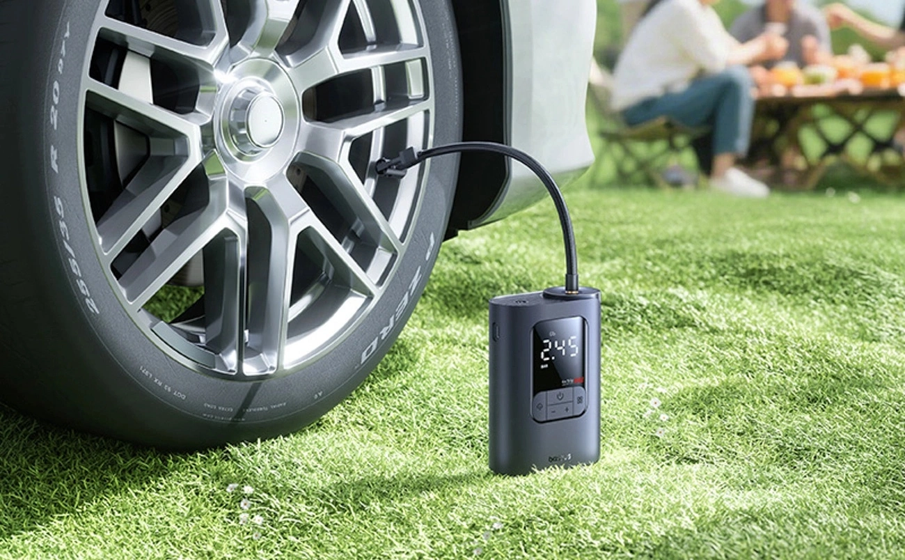 - Pojemność akumulatora: 7500 mAh - wystarcza na wielokrotne uzupełnienie powietrza bez konieczności ładowania.