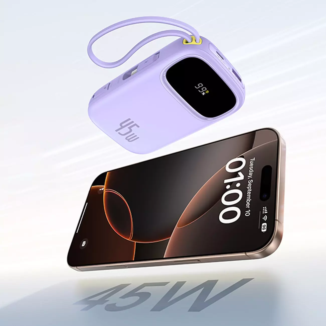 Powerbank Baseus EnerFill FC31 20000mAh 45W z wyświetlaczem z kablami USB-C i Lightning - fioletowy