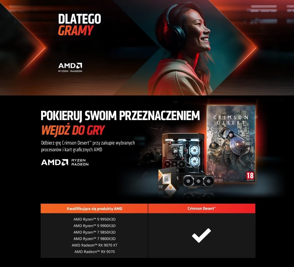 Startujemy z nową promocją typu game bundle, gdzie do zakupu wybranych procesorów AMD Ryzen i kart graficznych AMD Radeon serii RX lub skonfigurowanych systemów AMD, do zgarnięcia jest gra Crimson Desert . Poniżej lista kwalifikujących się produktów. Kampania trwa od 10 lutego 2026 r. do 25 kwietnia 2026 r., a kody na grę można realizować do 23 maja 2026 r.