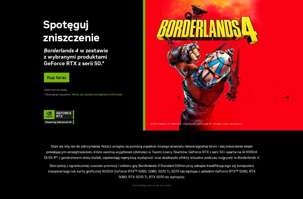 Spotęguj zniszczenie. Stań się siłą nie do zatrzymania. Niszcz wrogów za pomocą zupełnie nowego arsenału niewiarygodnej broni i siej zniszczenie dzięki powalającym umiejętnościom, które uwolnią wyjątkowe zdolności w Twoim Łowcy Skarbów. GeForce RTX z serii 50 i oparta na AI NVIDIA DLSS 4 z generatorem wielu klatek, zapewniają najwyższą wydajność oraz doskonałe efekty wizualne podczas rozgrywki w Borderlands 4. Skorzystaj z ograniczonej czasowo promocji i odbierz grę Borderlands 4 Standard Edition przy zakupie kwalifikującego się komputera stacjonarnego lub karty graficznej NVIDIA GeForce RTX 5090, 5080, 5070 Ti, 5070 lub laptopa z układem GeForce RTX 5090, RTX 5080, RTX 5070 Ti, RTX 5070 do laptopów.