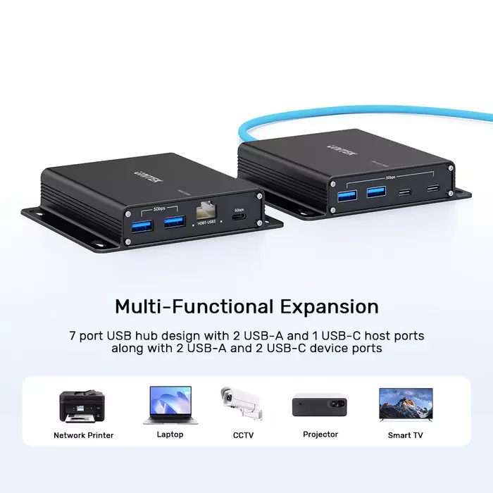 - Zasięg transmisji: 100 metrów - przesyłanie sygnału USB na dużą odległość za pomocą kabla CAT6a.