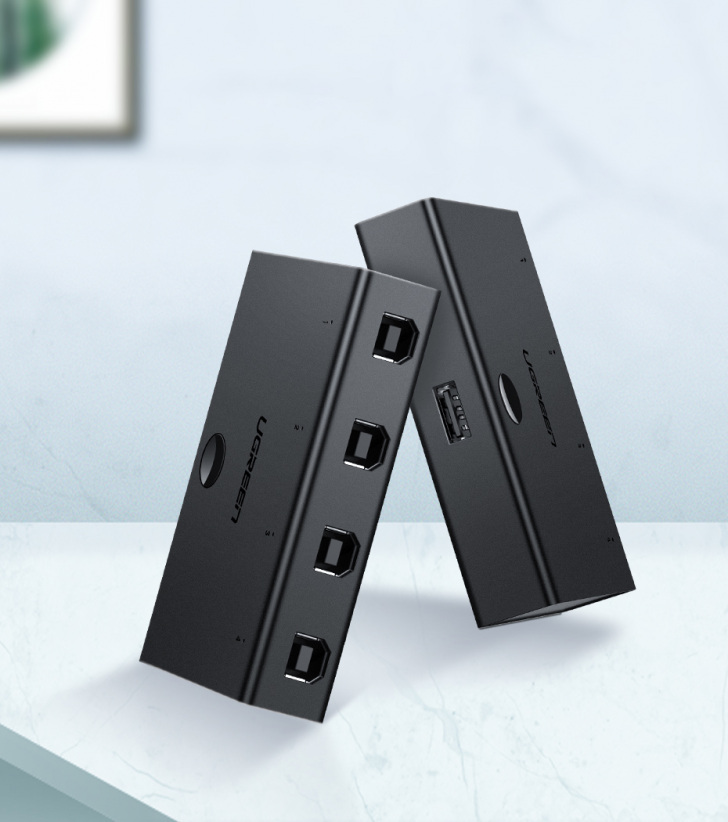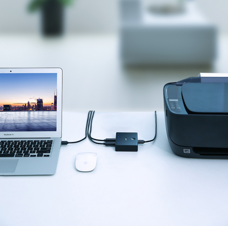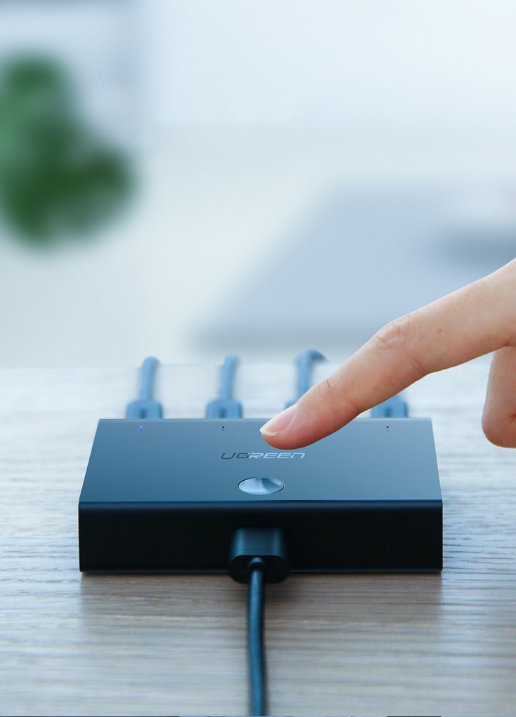 Podłącz do 4 urządzeń do switcha i w dowolnym momencie przełączaj przy pomocy przycisku, który znajduje się na górze, pomiędzy tymi urządzeniami. Przy każdym kablu prowadzącym do danego komputera znajduje się dioda LED dzięki, której dowiemy się, które urządzenie jest podłączone do drukarki w danym momencie.