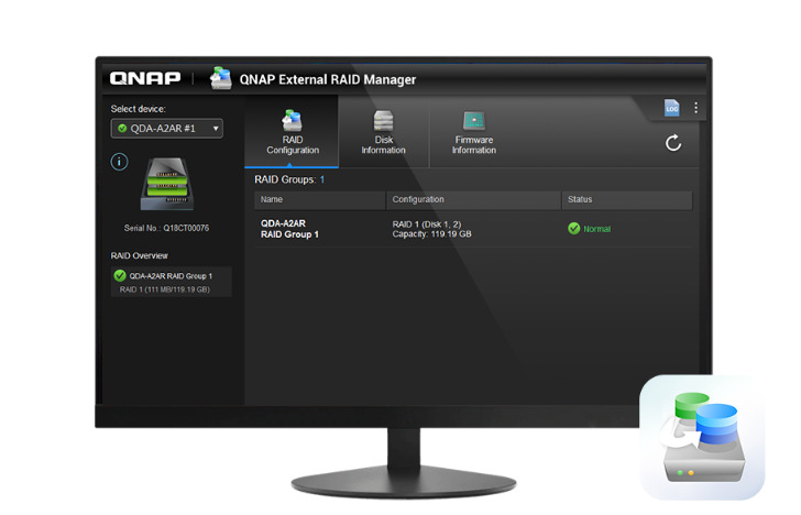 Narzędzie QNAP External RAID Manager umożliwia użytkownikom systemu Windows wyświetlanie informacji o stanie dysku i trybie RAID urządzenia QDA-A2AR. Przy użyciu narzędzia External RAID Manager można także zarządzać aktualizacjami oprogramowania układowego dla urządzenia QDA-A2AR.