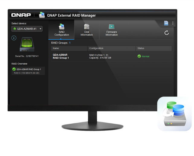 Narzędzie QNAP External RAID Manager umożliwia użytkownikom systemu Windows wyświetlanie informacji o stanie dysku i trybie RAID urządzenia QDA-A2MAR. Przy użyciu narzędzia External RAID Manager można także zarządzać aktualizacjami oprogramowania układowego dla urządzenia QDA-A2MAR.