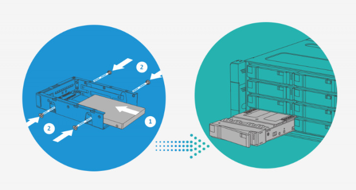 Model QDA-SA2 można łatwo zainstalować w serwerze Windows/Linux SAS z dwoma kontrolerami i w 3,5-calowej kieszeni dysku serwera Enterprise ZFS NAS (Model kieszeni dysku: SP-ES-TRAY-WOLOCK). (Serwer NAS wymaga wersji QES 2.0.0 (lub nowszej))