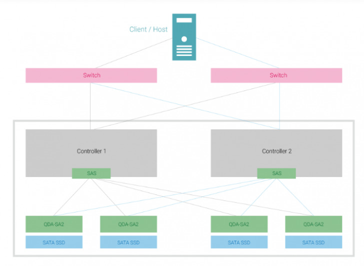 Dysk SAS jest wyposażony w dwa porty zapewniając redundancję, eliminując pojedyncze punkty awarii, zwiększając niezawodność oraz wydajność. Mimo że dyski SATA 6 Gb/s SSD zapewniają wysoką wydajność i przystępną cenowo pamięć masową, brak obsługi dwóch portów sprawia, że są nieodpowiednie dla środowisk z dwoma kontrolerami. Instalując dysk SATA SSD wraz z QDA-SA2 na serwerze Enterprise ZFS NAS z dwoma kontrolerami lub standardowym serwerze z dwoma kontrolerami, dysk SATA SSD oferuje te korzyści dwuportowego dysku SAS, zapewniając środowisko pamięci masowej dla przedsiębiorstw o wysokim stopniu dostępności i tolerancji na błędy.
