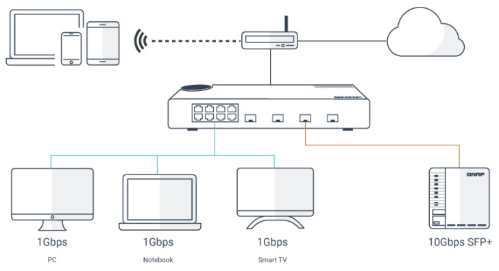 Począwszy od serwerów NAS z wbudowanymi portami 10GbE SFP+ i 10GBASE-T, po NAS z gniazdami PCIe obsługującymi karty sieciowe 10GbE/5GbE/2,5GbE, firma QNAP jest liderem w branży w zakresie wdrażania 10GbE. Inne rozwiązania sieci wysokiej szybkości QNAP obejmują karty sieciowe Thunderbolt 3 do 10GbE oraz karty sieciowe USB 3.2 Gen 1 do 5GbE. Wszystkie mogą być stosowane z modelem QSW-M408S, umożliwiając stworzenie pełnego środowiska sieciowego wysokiej szybkości, usprawniając wydajność takich zadań, jak edytowanie zdjęć/materiałów wideo, wirtualizacja, transfery danych w dużych plikach oraz innych zadań wymagających dużej przepustowości.