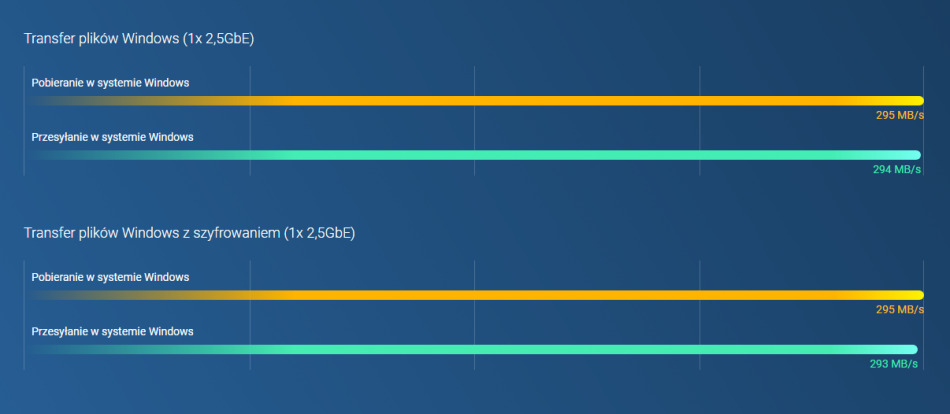 - Łączność 2,5GbE - ustawiając trunking portów z dwoma wbudowanymi portami 2,5GbE (2,5 G / 1 G / 100 M), można uzyskać prędkość transferu do 5 Gb/s.